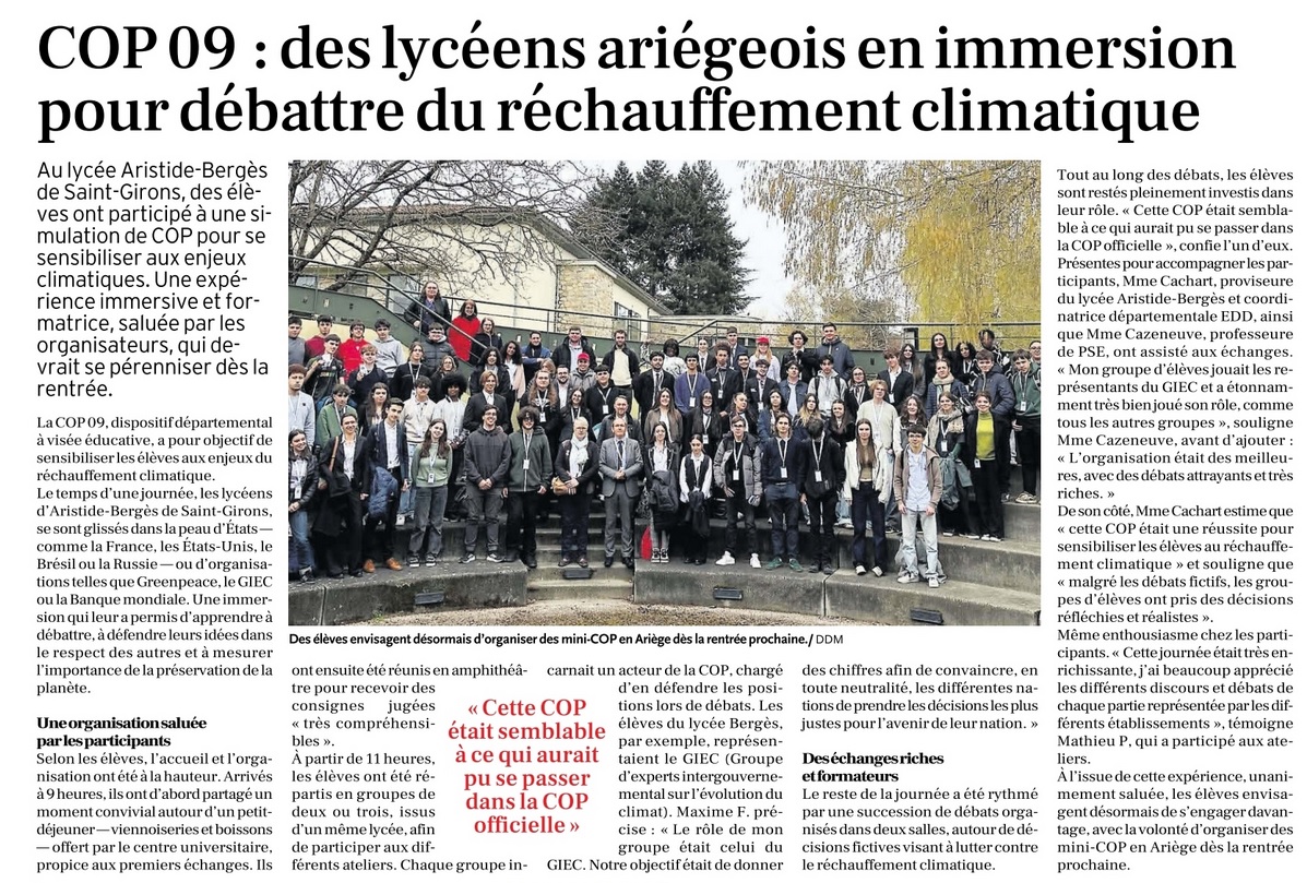 Des élèves de 2FMEMNB ont participé à la COP09 à Foix