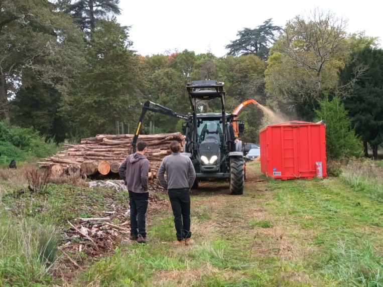 Pour obtenir du « bois énergie » il faut d’abord couper des arbres… Les bûcherons locaux utilisent pour cela une tête abatteuse. Les arbres coupés sont généralement des bois tordus ou de petite section, le principe étant d’assurer une gestion forestière durable.