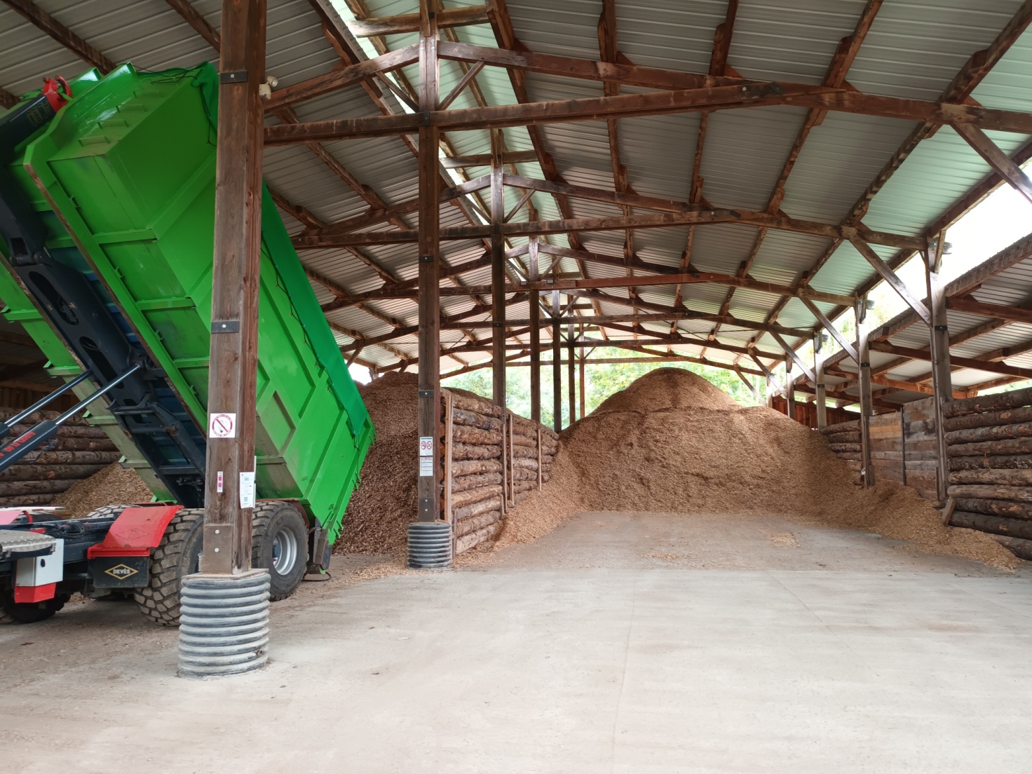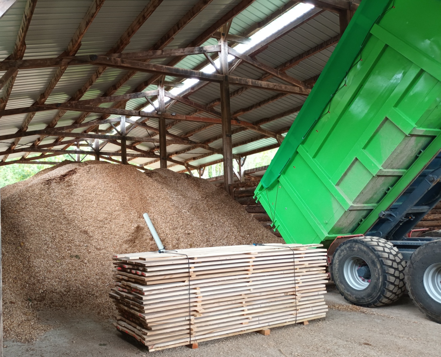 Une fois broyée, la plaquette forestière est acheminée vers le hangar pour le stockage et le séchage :