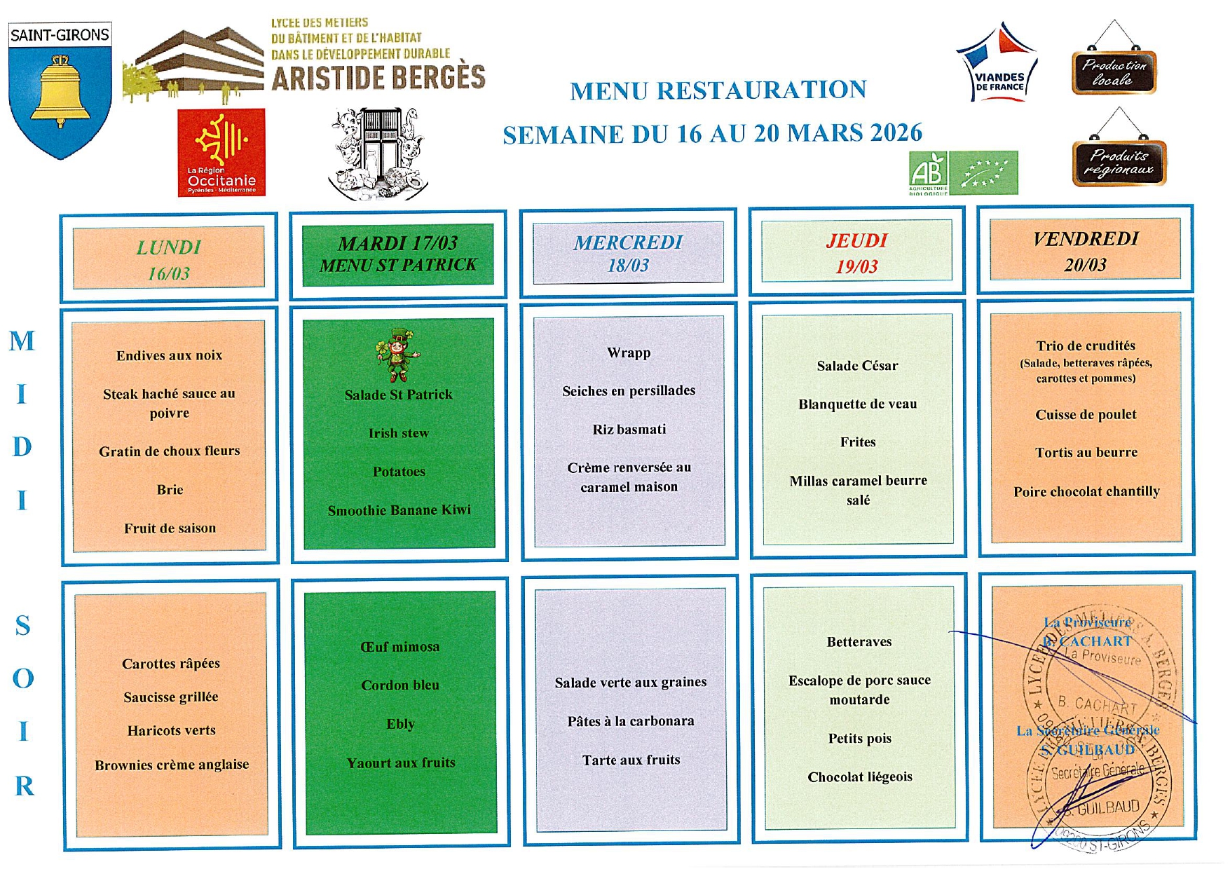 Menus du 16 au 20 mars 2026