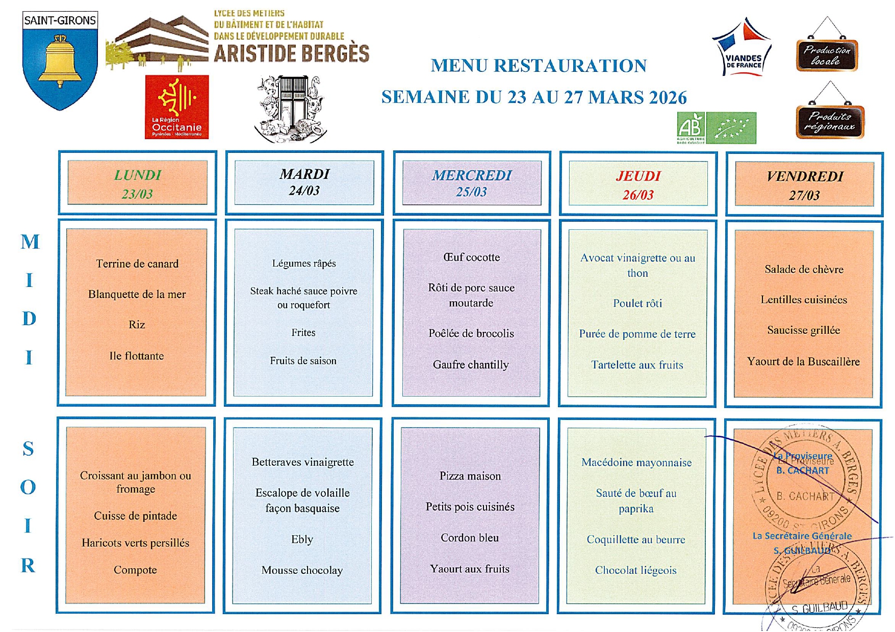 Menus du 23 au 27 mars 2026