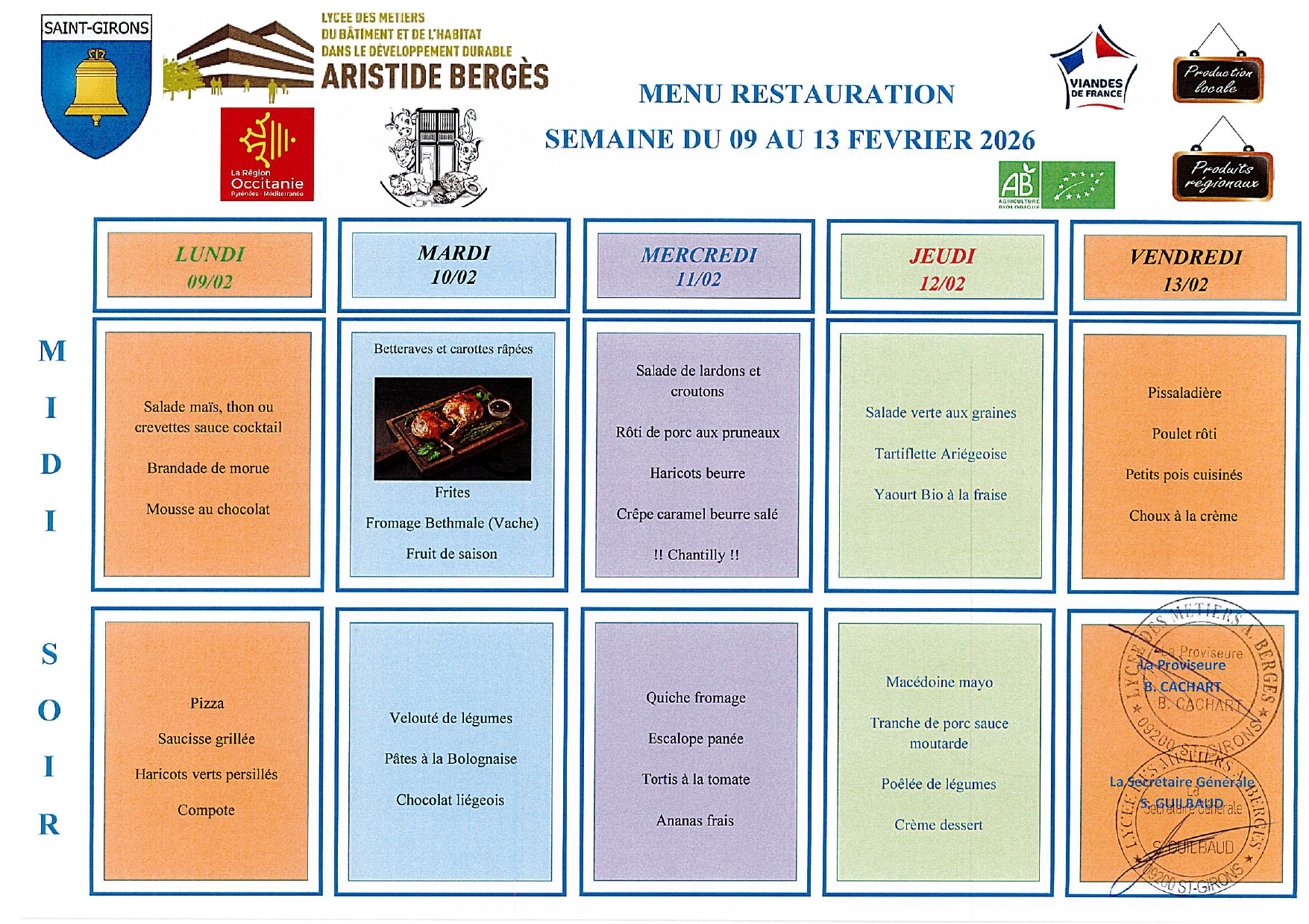 Menus du 9 au 13 février 2026